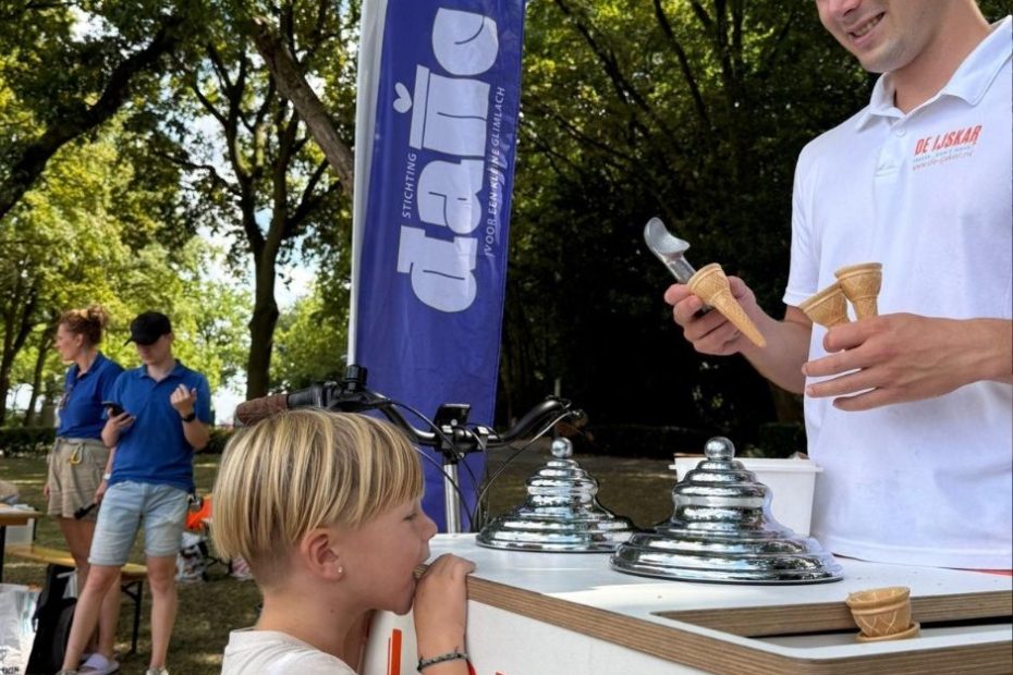 Benjamin van De IJskar schepte namens Stichting DANC voor alle kinderen én vrijwilligers van Kindervakantiespel ‘Onder De Panne’ Halsteren een heerlijke, verkoelend ijsje.